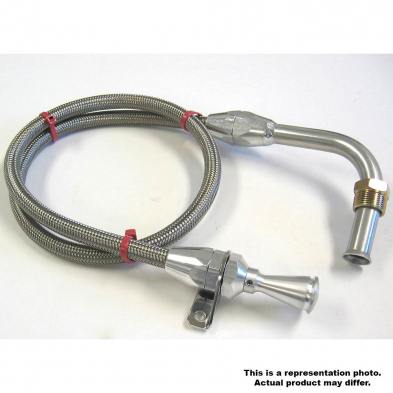 Kit comes complete with braided stainless outer housing and heat resistant, flexible inner measuring cable with E-Z to Read markings. Inner cable is molded with appropriate trans fluid levels. Kit includes dipstick funnel adapter to assist in filling. Firewall mount can be mounted anywhere you desire under the hood such as the firewall or inner fender apron, etc. Transmount dipstick mounts to the bell housing and the length varies according to the transmission application.