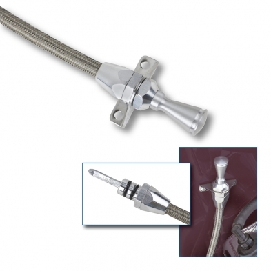 Kit comes complete with braided stainless outer housing and heat resistant, flexible inner measuring cable with E-Z to Read markings. Inner cable is molded with appropriate trans fluid levels. Kit includes dipstick funnel adapter to assist in filling. Firewall mount can be mounted anywhere you desire under the hood such as the firewall or inner fender apron, etc. Firewall mount recommended for full fendered cars and trucks. Special lengths available upon request.