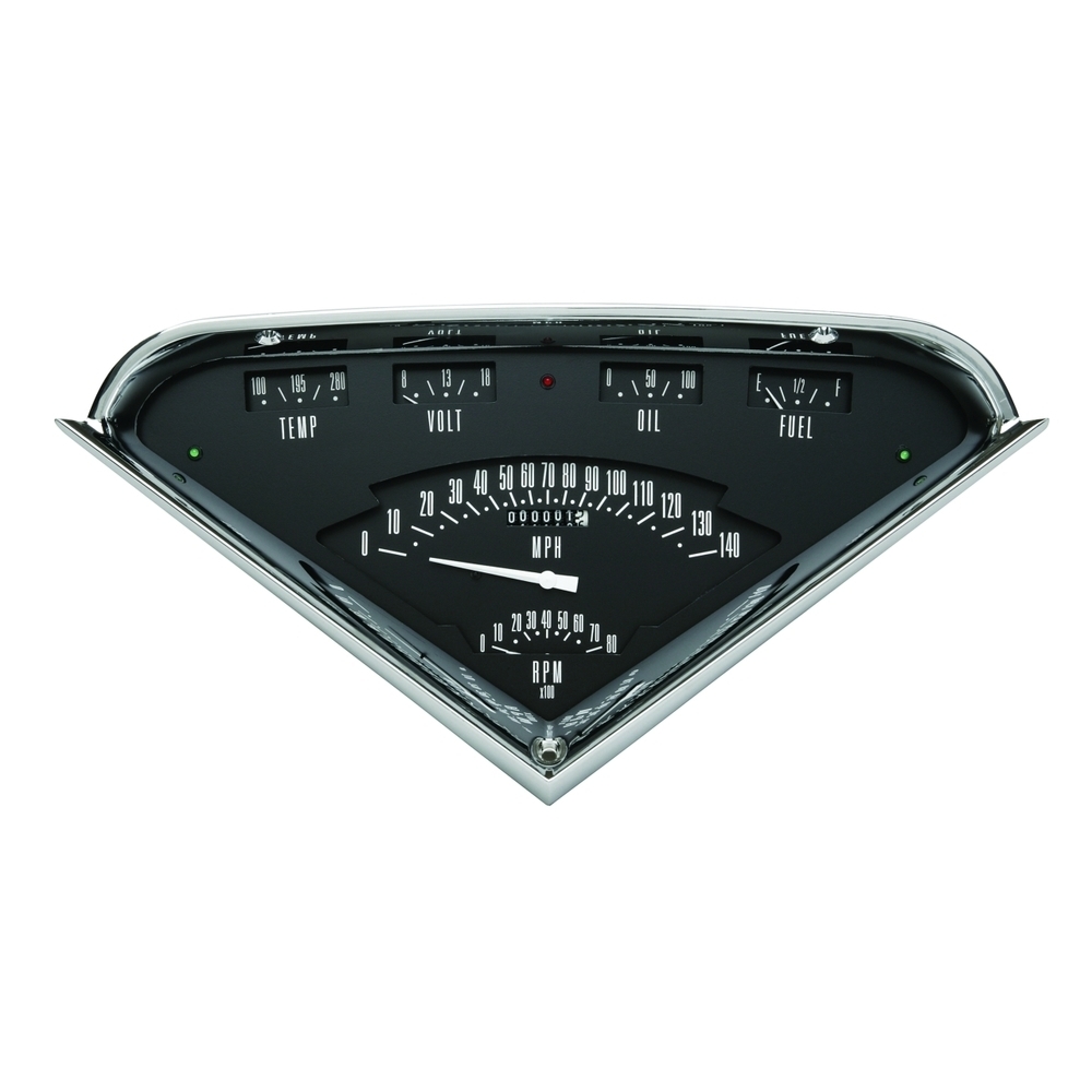 The 1955-59 Chevy Truck Black Tach Force Package, features a dual layer design with 0-140 mph Speedometer, 8000 rpm Tachometer, Fuel in 0-30 ohm, Oil, Temp and Volt gauges with LED turn signals and high beam indicator, plus built-in ECM filter signal switch. The package includes, installation hardware, all necessary sending units, and a wiring harness constructed of automotive grade TXL wire, machine-crimped terminals, tech-flex sleeving, and Molex main connectors. It includes ZST.