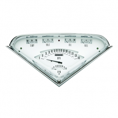 The 1955-59 Chevy Truck White Tach Force Package, features a dual layer design with 0-140 mph Speedometer, 8000 rpm Tachometer, Fuel in 0-30 ohm, Oil, Temp and Volt gauges with LED turn signals and high beam indicator, plus built-in ECM filter signal switch. The package includes, installation hardware, all necessary sending units, and a wiring harness constructed of automotive grade TXL wire, machine-crimped terminals, tech-flex sleeving, and Molex main connectors. It includes ZST.