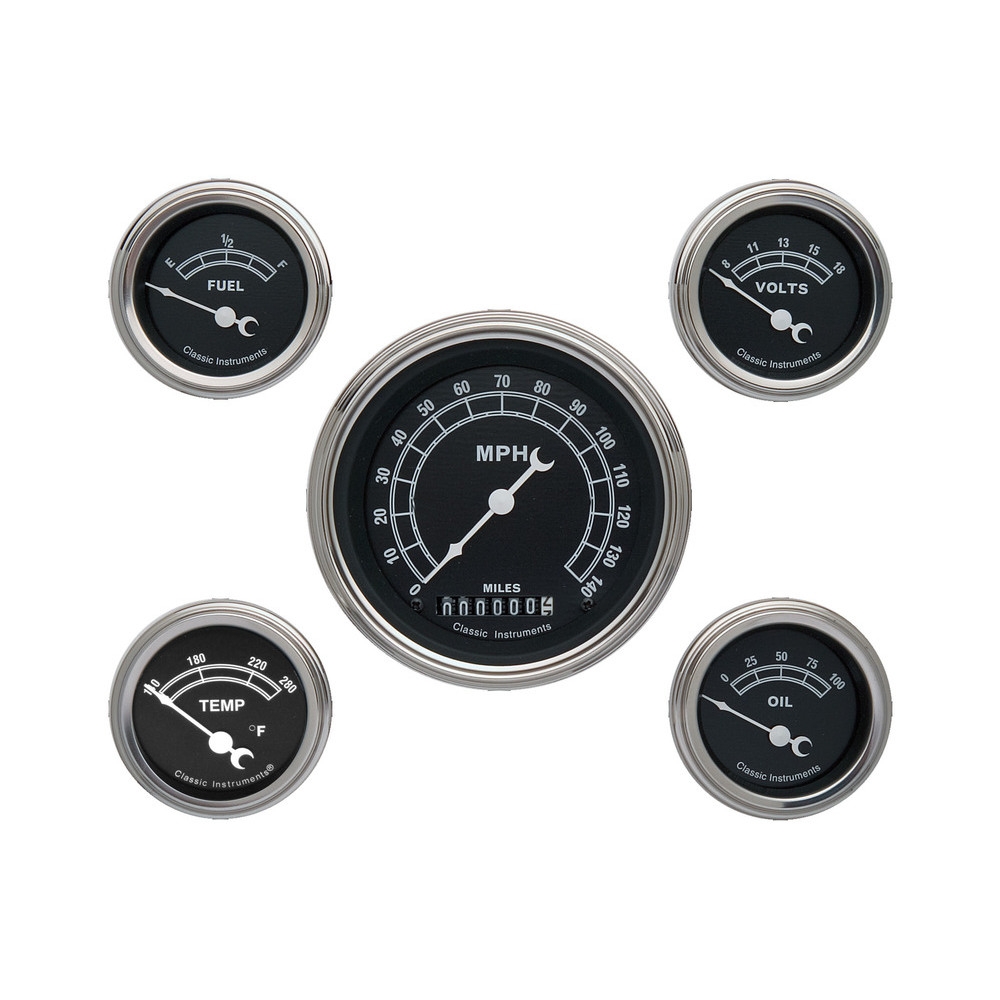 The Tradtional Series 5 Gauge Kit 3-3/8" Speedometer and 2-1/8" Fuel, Oil, Temp and Volt with Stainless Low Step Bezels and Curved Glass Lens.