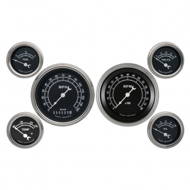 The Tradtional Series 6 Gauge Kit 3-3/8" Speedometer and Tachometer plus 2-1/8" Fuel, Oil, Temp and Volt with Stainless Low Step Bezels and Curved Glass Lens.