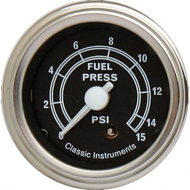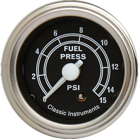 The Tradtional Series 2-1/8" Fuel Pressure Gauge in 0-15 psi Range (Mechanical Exterior Mount) with Stainless Low Step Bezels and Curved Glass Lens.