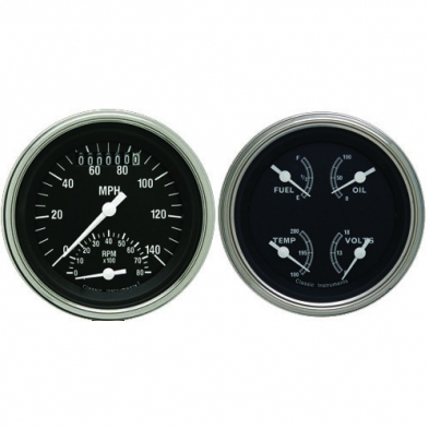 The Tradtional Series 2 Gauge Kit 3-3/8" Ultimate Speedometer Speedo/Tach Combo and Quad (Fuel, Oil, Temp and Volt) Gauges with Stainless Low Step Bezels and Curved Glass Lens.