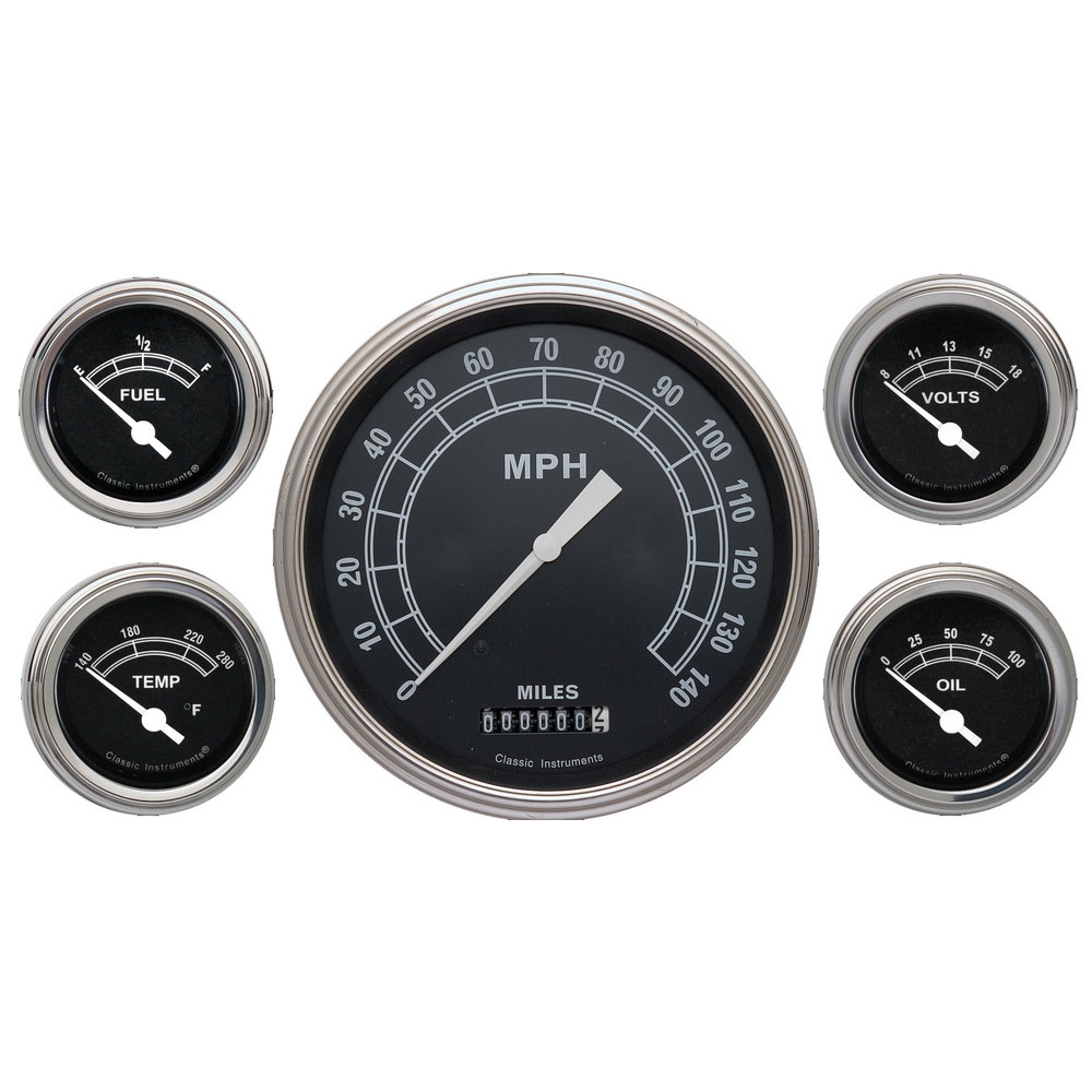 The Tradtional Series 5 Gauge Kit 4-5/8" Speedometer and 2-1/8" Fuel, Oil, Temp and Volt Gauges with Stainless Low Step Bezels and Curved Glass Lens.