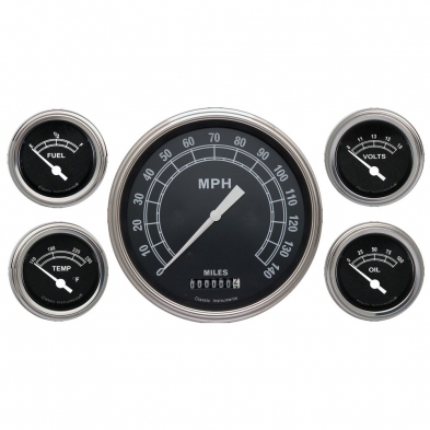 The Tradtional Series 5 Gauge Kit 4-5/8" Speedometer and 2-1/8" Fuel, Oil, Temp and Volt Gauges with Stainless Low Step Bezels and Flat Glass Lens.