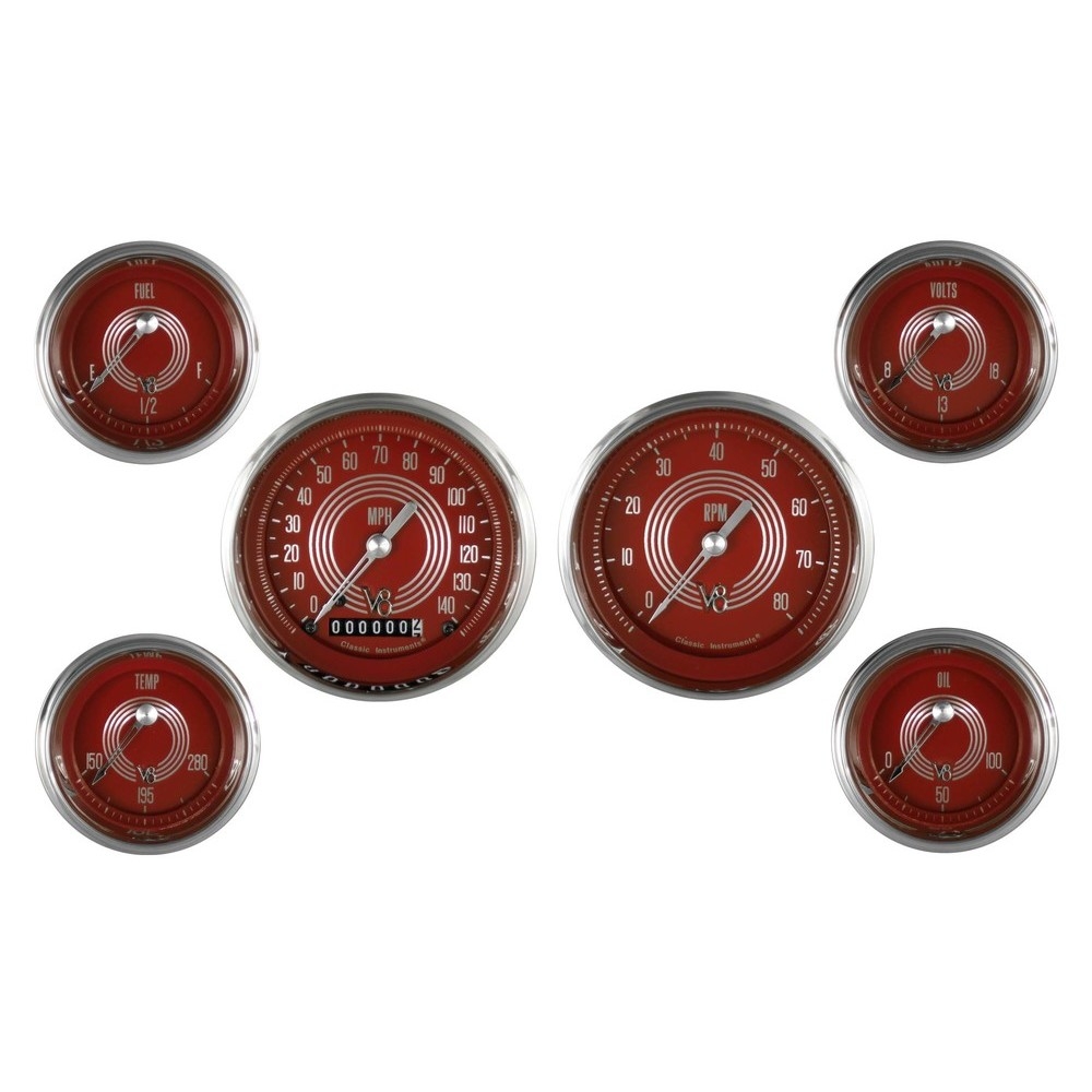 This 6 Gauge Kit the V8 Red Steelie features 3-3/8" Speedometer, Tach and 2-1/8" Fuel, Temp, Oil and Volts Gauges with Stainless High Step Bezels and Curved Glass Lens.