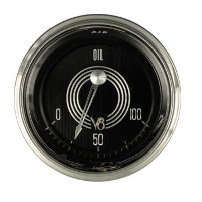 This V8 Speedster 2-1/8" Oil Pressure Gauge in 0-100 psi Range with Stainless High Step Bezels and Curved Glass Lens.