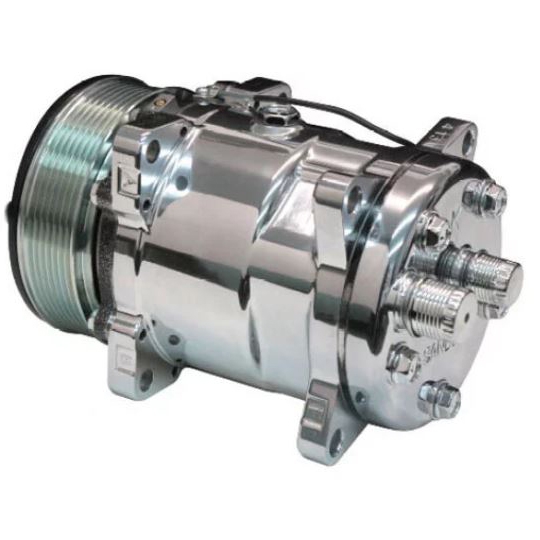 These are a great solution to low hood clearance issues. SD 508 compressor with rear exit #8 and #10 male 0-ring fittings. Compatible with standard female O-ring fittings and 90 degree TiteFit fittings.