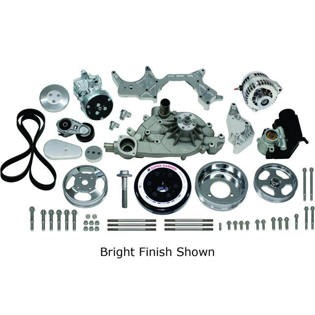 Designed for GM LS7 applications with power steering this kit features a Detroit Speed aluminum power steering pump black anodized brackets a chrome compressor and alternator black hardcoat pulleys and black anodized clutch and tensioner covers.