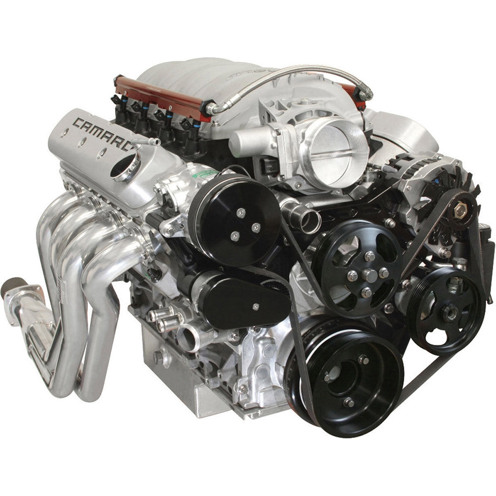 Designed for GM LS7 applications with power steering (pump not included) this kit features black anodized brackets, natural finish compressor, natural finish alternator, black hard coat pulleys, black anodized A/C compressor clutch cover and black anodized tensioner cover.