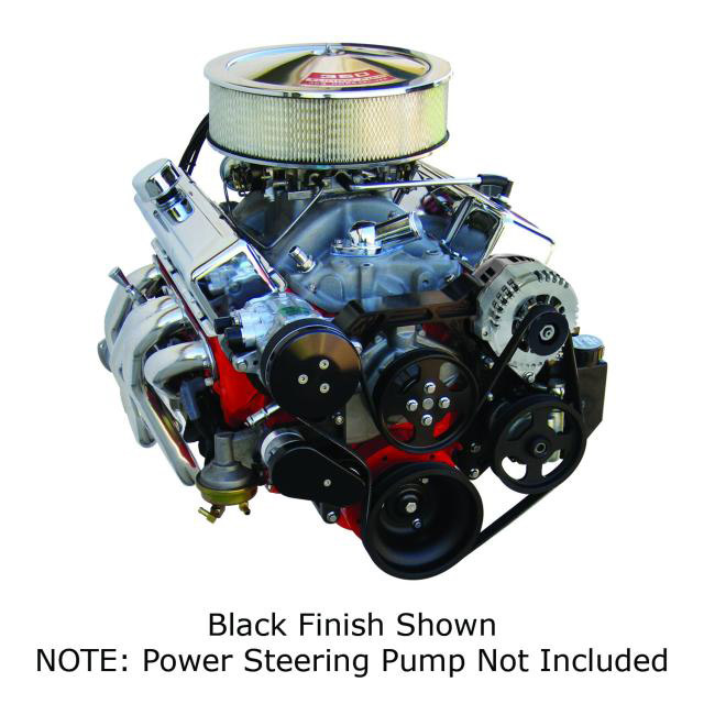 Designed for Small Block Chevrolet applications with power steering (pump not included) this kit features black anodized brackets a chrome compressor and alternator black hardcoat pulleys and black anodized clutch and tensioner covers.