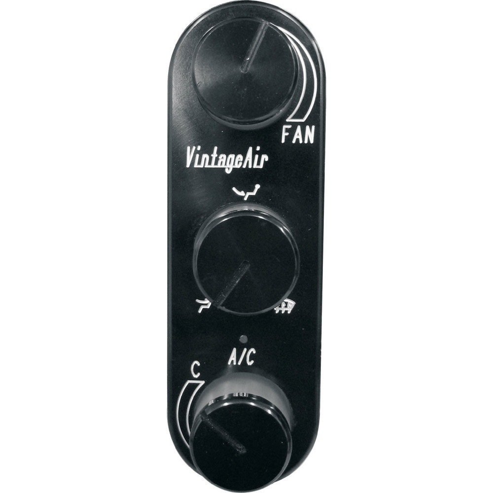 This is a Vintage Air vertical machined aluminum rotary control panel that features a black anodized face and knobs with engraved icons and includes their exclusive soft white LED lighting in each knob. This panel measures 1.25 Inches x 4.125 Inches x 1.25 Inches deep.