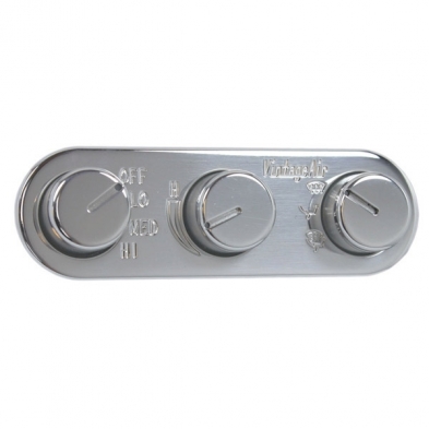 This is a Vintage Air Gen II ProLine 3 knob heater control panel that has a black anodized face and knobs. This panels include their exclusive soft white lighting in each knob.