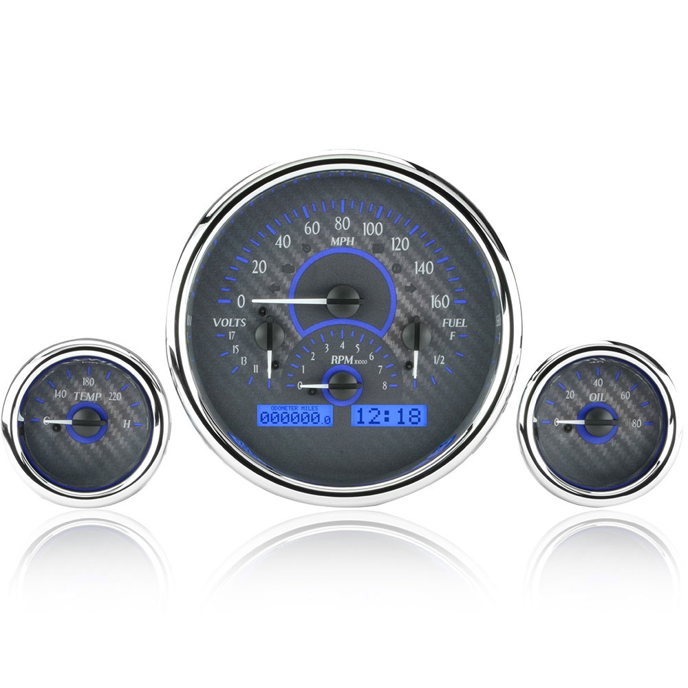 Made popular by the ‘57 Chevy, this contemporary triple gauge layout lends itself to an enormous amount of flexbility. With the larger instrument measuring 6.25” overall and the two smaller gauges at 3”, this is one distinctive choice. Chromed billet aluminum housings and bezels round out the package.