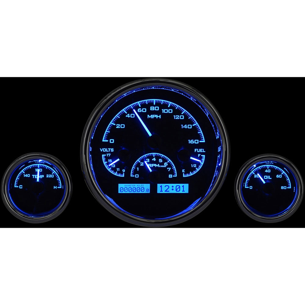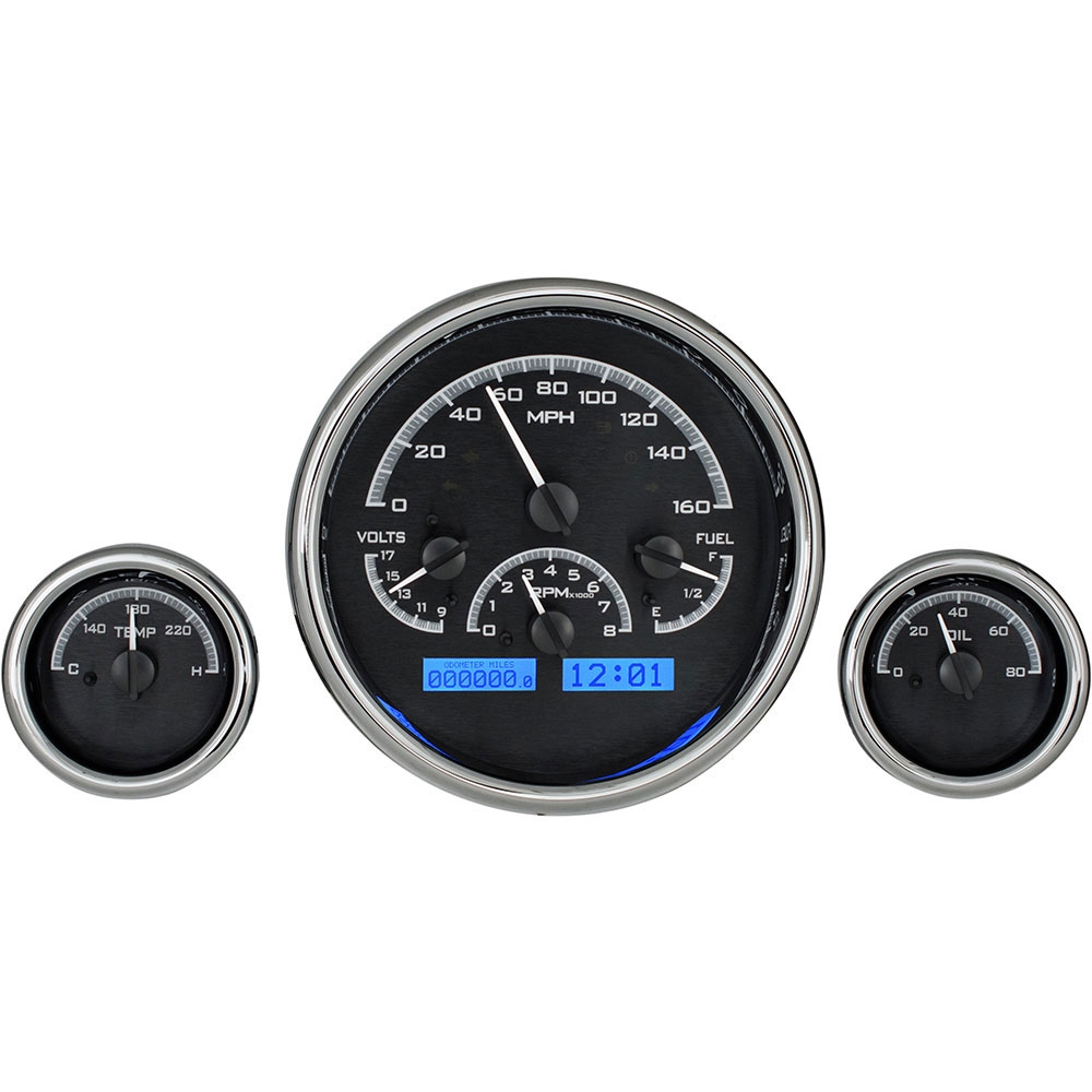 Made popular by the ‘57 Chevy, this contemporary triple gauge layout lends itself to an enormous amount of flexbility. With the larger instrument measuring 6.25” overall and the two smaller gauges at 3”, this is one distinctive choice. Chromed billet aluminum housings and bezels round out the package.