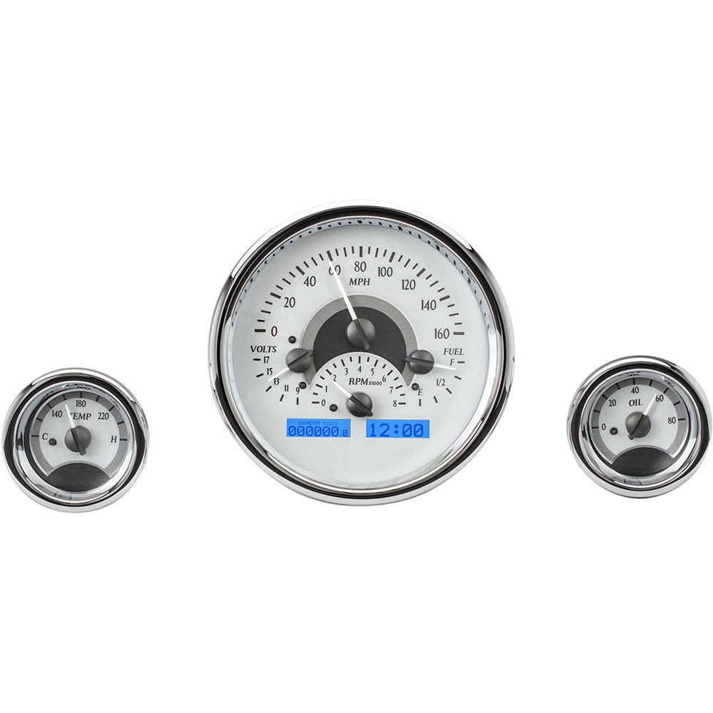 Made popular by the ‘57 Chevy, this contemporary triple gauge layout lends itself to an enormous amount of flexbility. With the larger instrument measuring 6.25” overall and the two smaller gauges at 3”, this is one distinctive choice. Chromed billet aluminum housings and bezels round out the package.