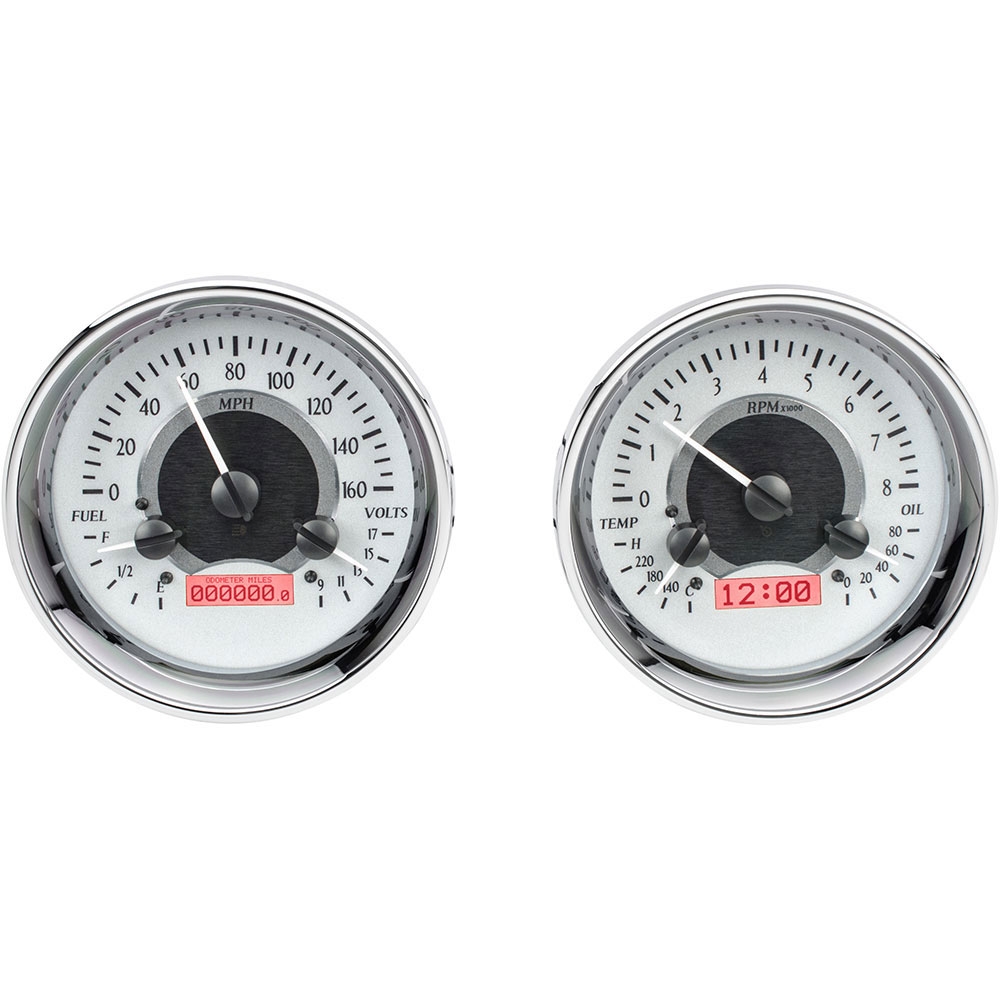 A new look on a traditional layout, the dual round gauge format has been a design staple for generations. Allowing flexibility into nearly any type of vehicle, these 5.4” dual round packages complement several vehicle themes. Gauge housings machined from 6061 aluminum, finished in flawless chrome plating. Cutout diameter of 5”, Depth of 1.85”.