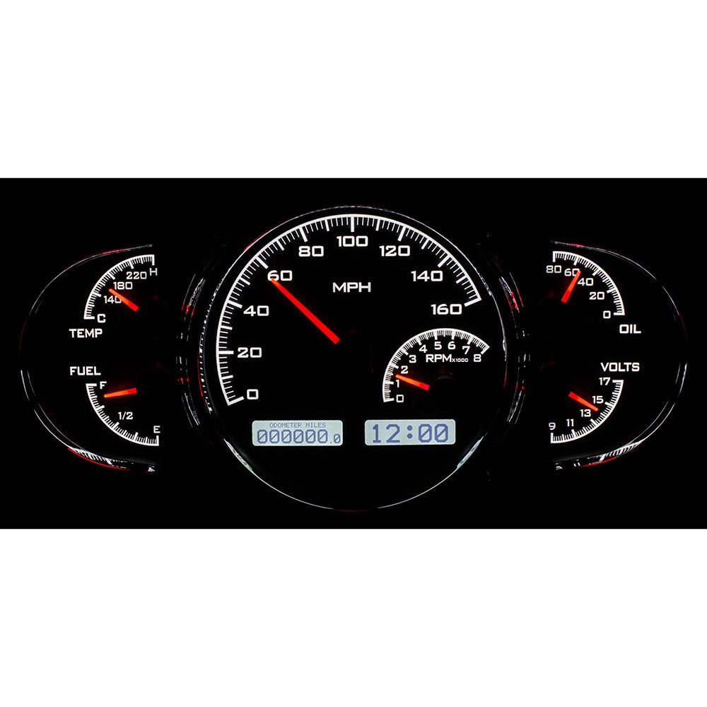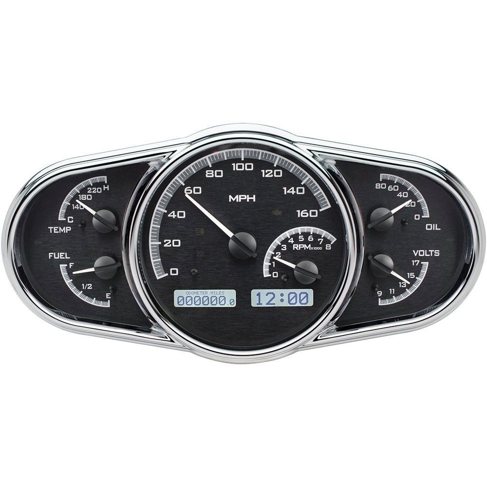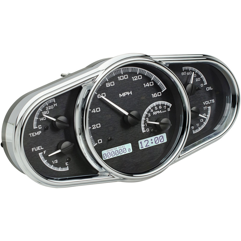 The new Dakota Ditigal Universal VHX-1016 Elliptical gauge cluster measures 10-1/8" W x 5" H and includes a triple-chrome plated, machined aluminum gauge housing.