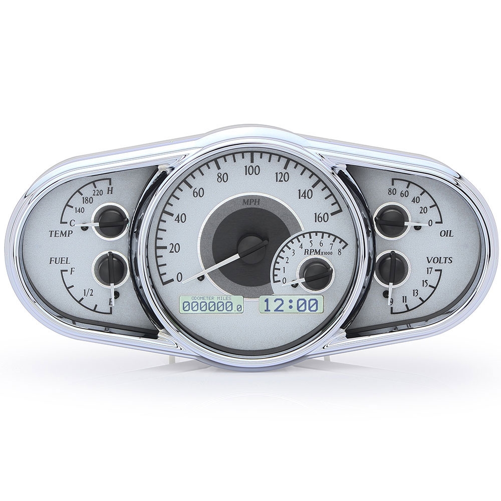 The new Dakota Ditigal Universal VHX-1016 Elliptical gauge cluster measures 10-1/8" W x 5" H and includes a triple-chrome plated, machined aluminum gauge housing.