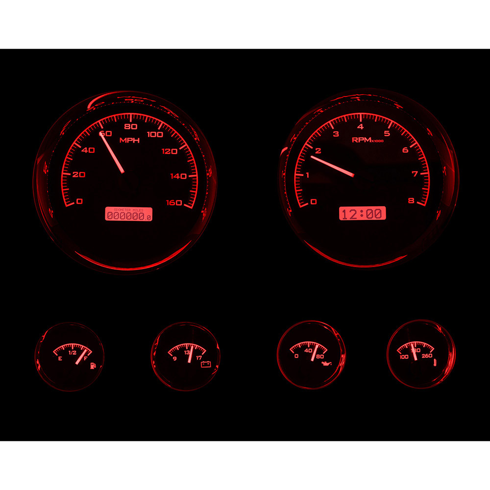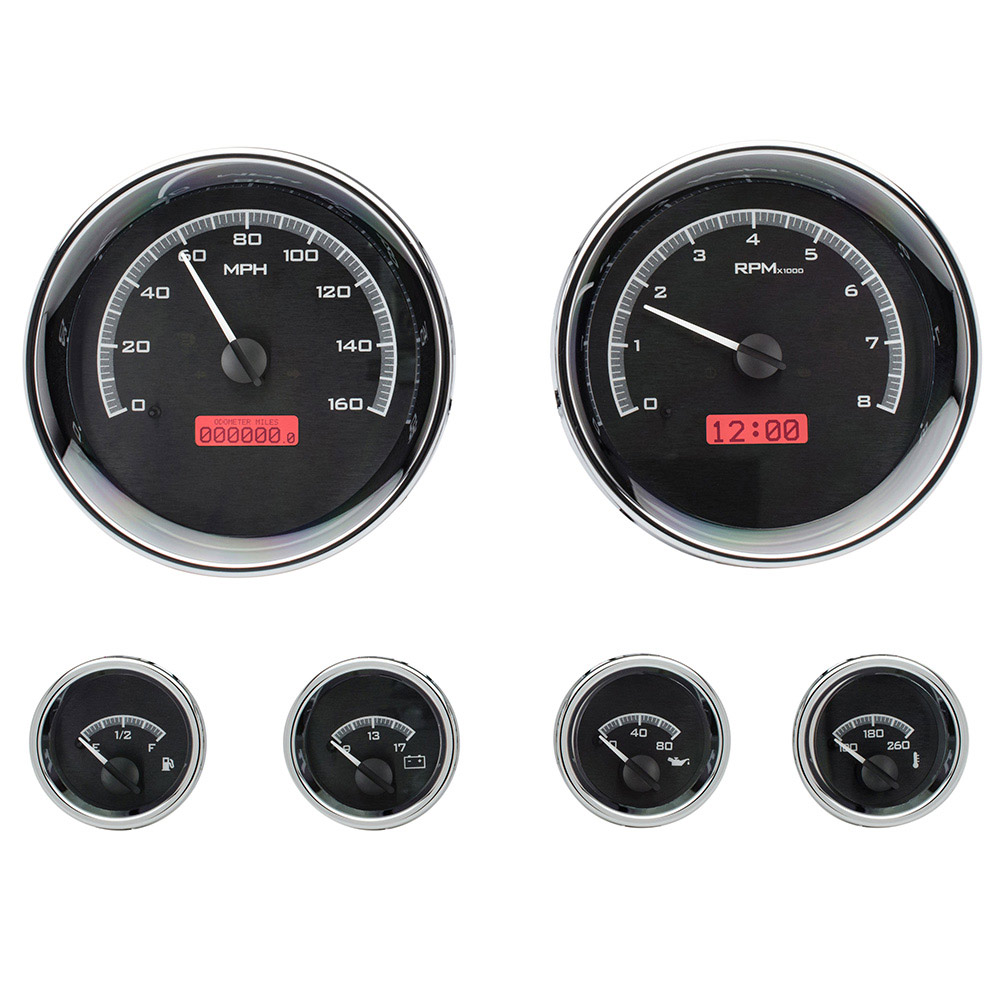 The Dakota Digital VHX-1024 larger instruments measures 5.4" overall (5” Cutout) and the four smaller gauges at 2.3" (2.05” Cutout), this is one distinctive choice. Chromed billet aluminum housings and bezels round out the package.