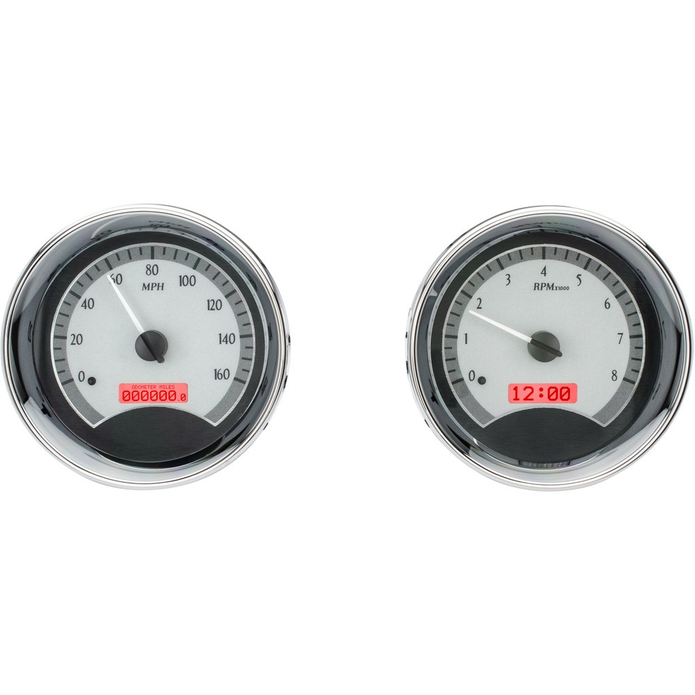 The Dakota Digital VHX-1024 larger instruments measures 5.4" overall (5” Cutout) and the four smaller gauges at 2.3" (2.05” Cutout), this is one distinctive choice. Chromed billet aluminum housings and bezels round out the package.