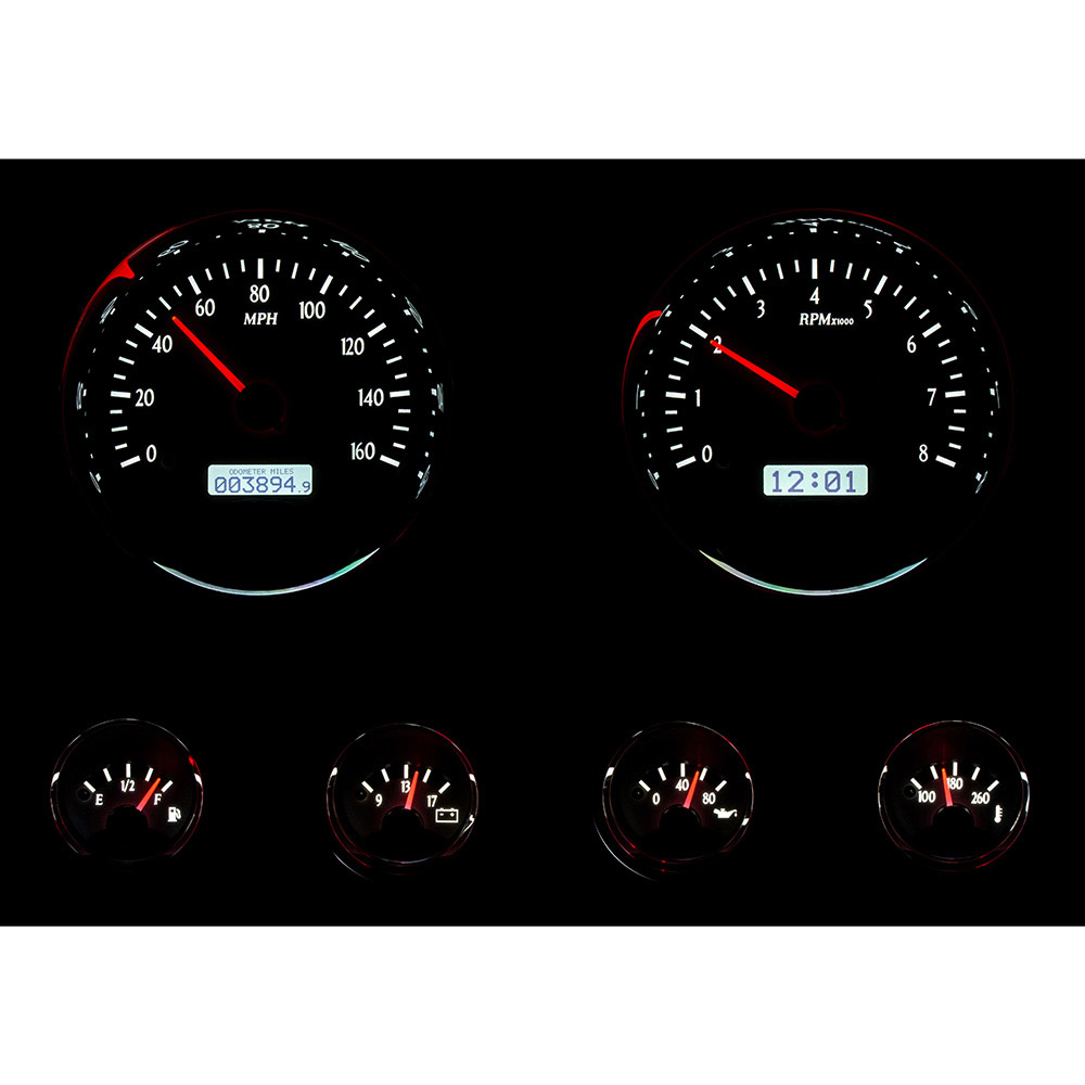 The Dakota Digital VHX-1024 larger instruments measures 5.4" overall (5” Cutout) and the four smaller gauges at 2.3" (2.05” Cutout), this is one distinctive choice. Chromed billet aluminum housings and bezels round out the package.