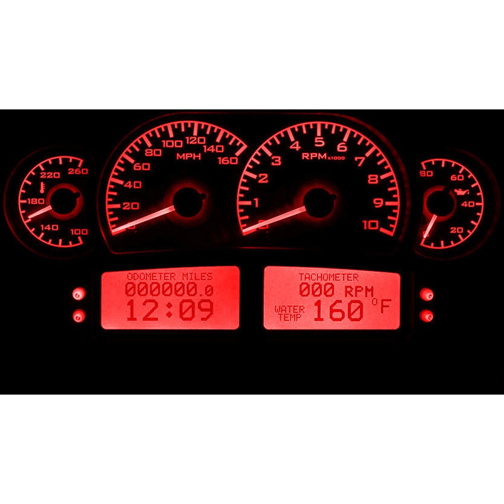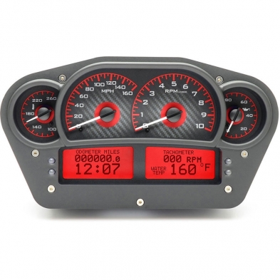 The VHX-1100 is a whole new breed of instrument system. Created as a crossover between the pure function of race gauges and the usability of street instrumentation, this system provides the best of both worlds. With a 0-160 MPH Speedometer, a 0-10,000 RPM Tach and large-sweep Oil Pressure and Temperature gauges, even the most radical of applications are covered. Four programmable, digital message centers allow for nearly unlimited expansion.