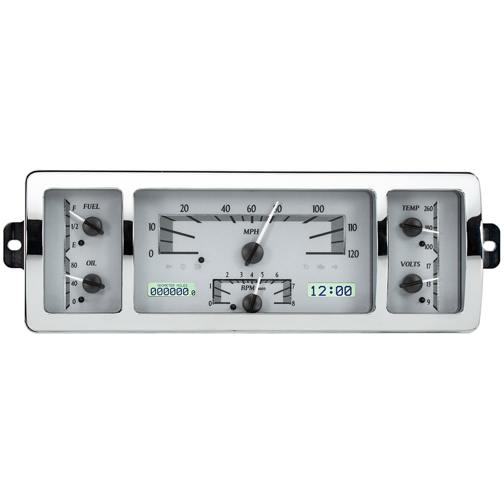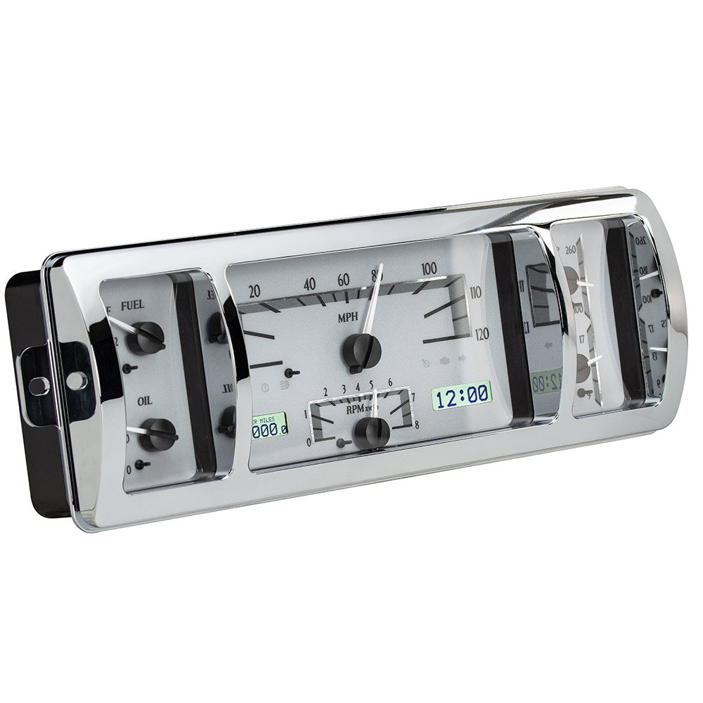 This Dakota Digital gauge kit is a direct fit replacement for 1940- 46 Chevrolet pickups, this kit includes a chrome machined aluminum font bezel. Available with your choice of black or silver face styling; either way you get six analog gauge readings augmented by a pair of LCD digital message centers. Speedometer runs to 120mph, and the supplied sensors make installation a breeze, whatever engine and transmission you choose!