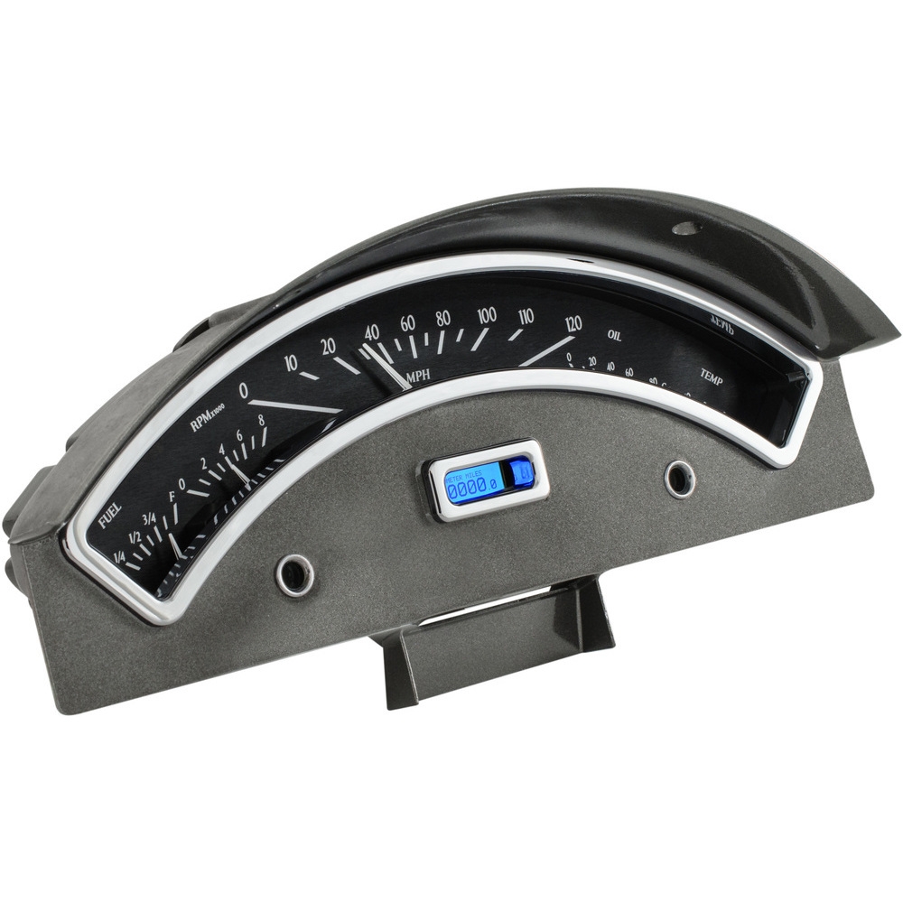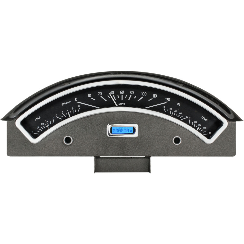 This Dakota Digital VHX gauge kit fits directly into the stock dash of a 1957 Ford Full-size Car without modification (does not fit Thunderbird). Included in this kit are new fully machined chrome trim for the upper arched gauge, as well as the rectangular odometer opening. *Factory dash and Oil and Generator bezels and lens not included.