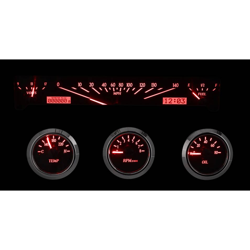 This Dakota Digital VHX System fits directly into the stock dash of a 1961-62 Chevy Impala without modification. The upper (speedometer/voltmeter/fuel level/message centers) display utilizes the stock trim ring, whereas the lower displays (tachometer/oil pressure/water temp) include machined aluminum/chromed new instrument housings.