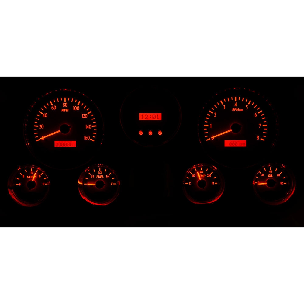 Fully lit needles, backlit faces, and highly visible LCD message centers are a few of the things that you can see which set the VHX Series apart from yesterday’s traditional approach to instrumentation. A few of the features which you don’t normally see are the micro-controlled precision stepper motors, solid state sensors for unparalleled accuracy, and user-customizable display feedback, all supported by an unrivaled limited lifetime warranty which has become the standard for Dakota Digital instrumentation systems . Completely engineered and manufactured at our facility in Sioux Falls, South Dakota, the VHX Series has completely revolutionized the instrumentation industry! This Kit has a Digital clock/ display center.