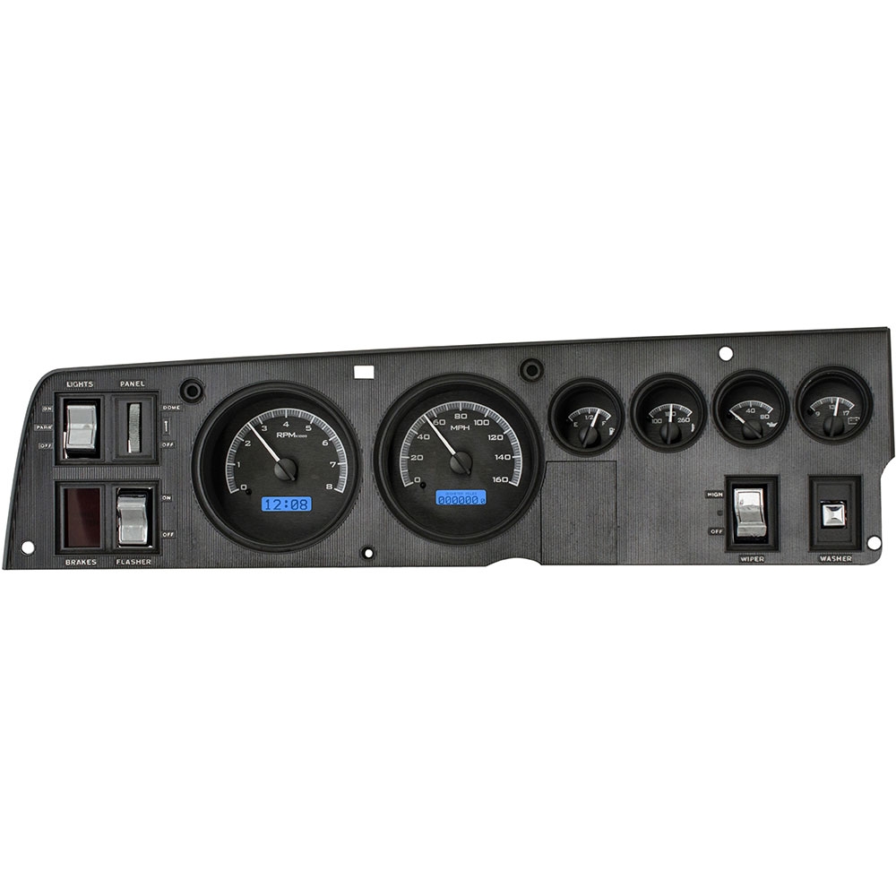 This Dakota Digital VHX gauge kit fits directly into the stock instrument bezel of a 1968-70 Dodge Charger/Super Bee, 1969-70 Coronet, 1970 Plymouth GTX/Roadrunner without modification, adding a wealth of features to this iconic vehicle.