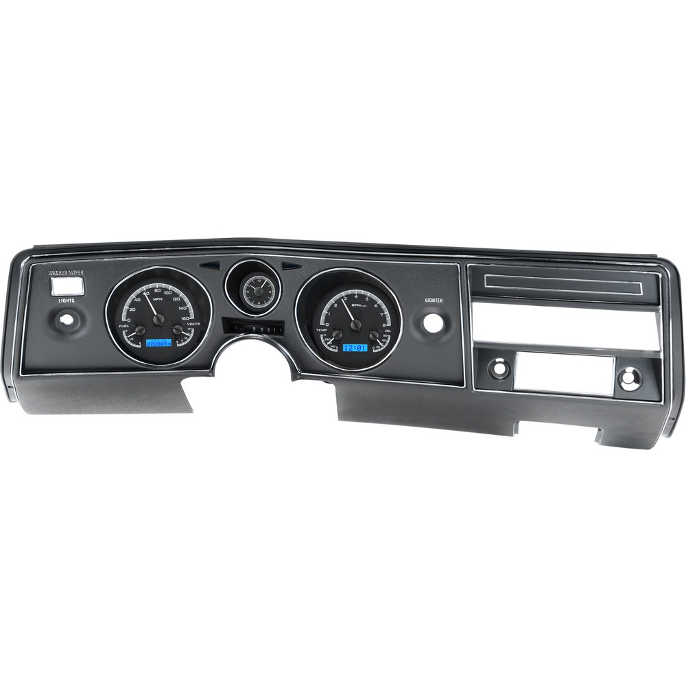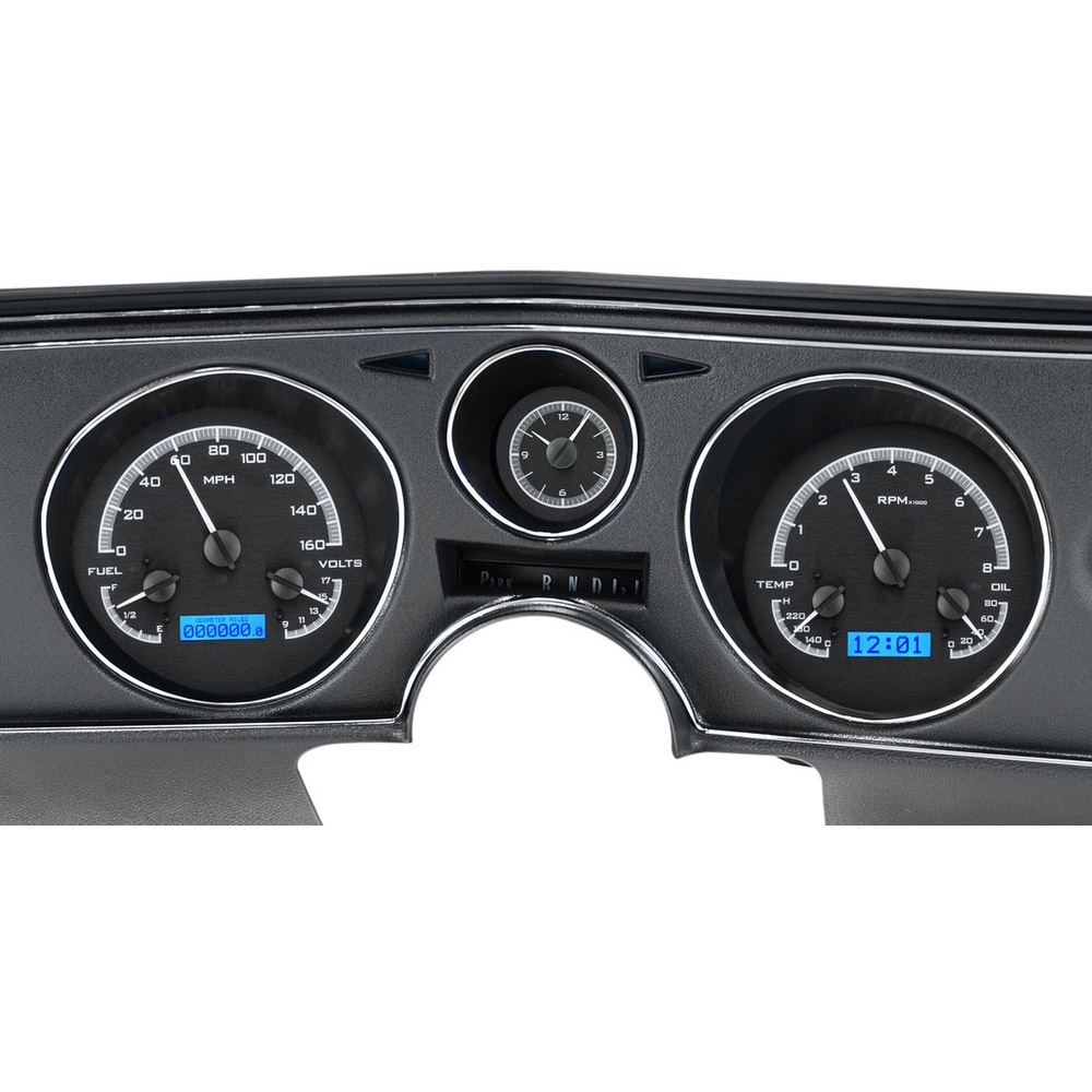 The new VHX Systems fit directly into the stock instrument bezel of a 1969 Chevy Chevelle and El Camino without modification, adding a wealth of features to this iconic vehicle. This Kit comes with a analog clock with needles in The center