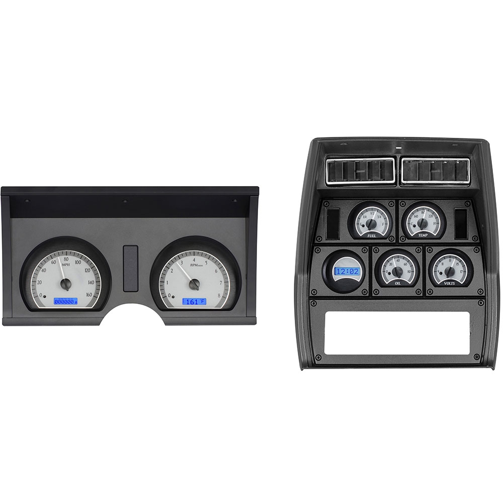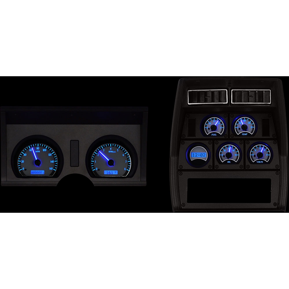Dakota Digital VHX Systems fit directly into the stock instrument dash of a 1978-82 Chevy Corvette without modification, adding a wealth of features to this iconic vehicle. Speedometer and Tachometer gauge housing has been completely replicated in billet aluminum, powdercoated in a flat black to keep the original theme.Oil Pressure, Water Temperature, Voltmeter, Fuel Level and an additional LCD Clock and Message Center attach directly to the back side of the stock center console bezel.