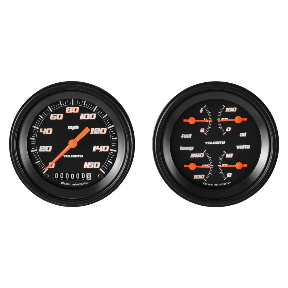 This 2 Gauge Kit Includes Velocity Black Series 3-3/8" Speedometer and Quad Gauge Kit that includes Fuel, Oil, Temp and Volt Gauges with Black Low Step Bezels and Flat Glass Lenses.