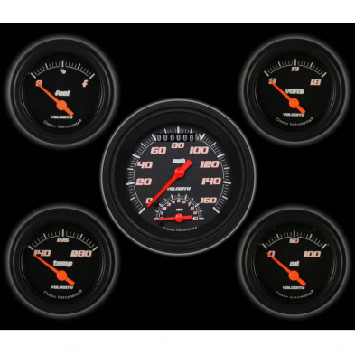 This 5 Gauge Kit Includes Velocity Black Series 3-3/8" Ultimate Speedometer Speedo/Tach Combo 2-1/8" Fuel, Oil, Temp and Volt Gauges with Black Low Step Bezels and Flat Glass Lenses. Please Note that the Ultimate speedometer features a built in ECM filter signal switch.