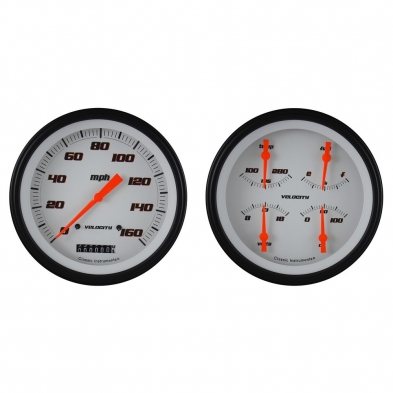 This 2 Gauge Kit Includes Velocity White Series 3-3/8" Speedometer and Quad Gauge Kit that includes Fuel, Oil, Temp and Volt Gauges with Black Low Step Bezels and Flat Glass Lenses.