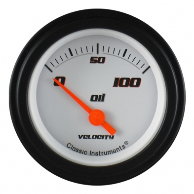 The Velocity White Series 2-/18" Oil Pressure Gauge in 0-100 psi Range with Black Low Step Bezels and Flat Glass Lenses.