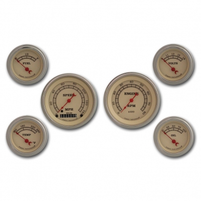 This 6 Gauge Kit Vintage Series 3-3/8" Speedo, Tach and 2-1/8" Fuel, Oil, Temp and Volt Gauges with Stainless Low Step Bezel Curved Glass Lens.