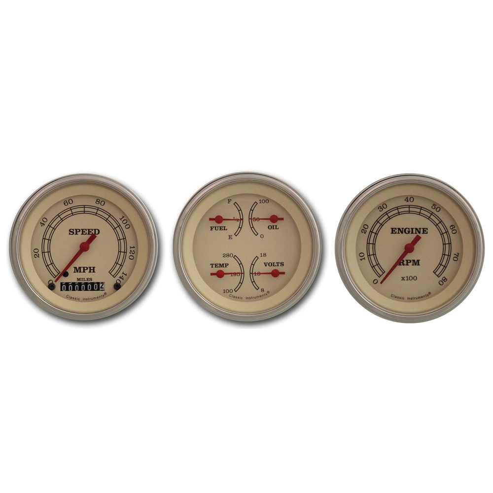 This 3 Gauge Kit Vintage Series 4-5/8" Speedometer, Tach and Quad that include Fuel, Oil, Temp and Volt Gauges with Stainless Low Step Bezel Flat Glass Lens.
