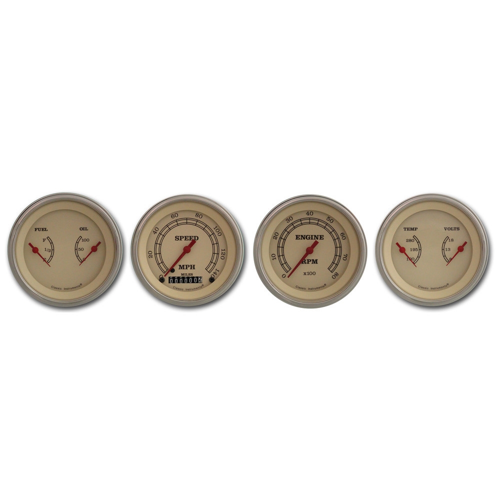 This 4 Gauge Kit Vintage Series 3-3/8" Speedometer, Tach and 2 Duals that include Fuel and Oil Plus Temp and Volt Gauges with Stainless Low Step Bezel Flat Glass Lens.