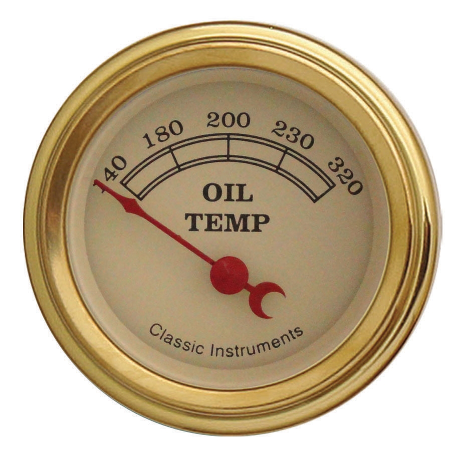 The Vintage Series 2-1/8" Oil Temperature Gauge in 140-320 Degree Range with Gold Low Step Bezel Curved Glass Lens.
