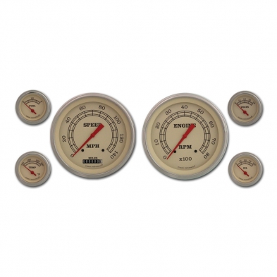 This 6 Gauge Kit Vintage Series 4-5/8" Speedometer, Tach 2-1/8" Fuel, Oil, Temp and Volt Gauges with Stainless Low Step Bezel Curved Glass Lens.