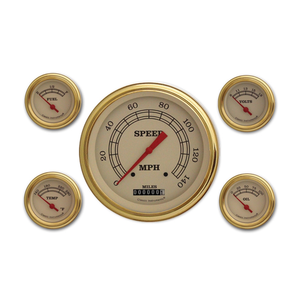 This 5 Gauge Kit Vintage Series 4-5/8" Speedometer and 2-1/8" Fuel, Oil, Temp and Volt Gauges with Gold Low Step Bezel Curved Glass Lens.