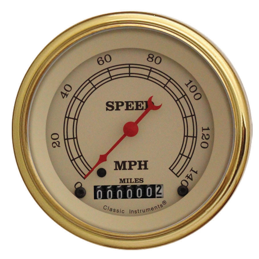 The Vintage Series 3-3/8" Speedometer Gauge in 0-140 mph Range with Gold Low Step Bezel Flat Glass Lens.