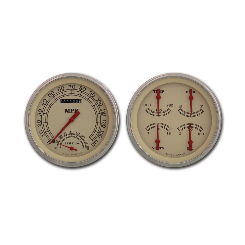 This 2 Gauge Kit Vintage Series 4-5/8" SpeedTachular Speedo/Tach Combo and Quad that include Fuel, Oil, Temp and Volt Gauges with Stainless Low Step Bezel Curved Glass Lens.