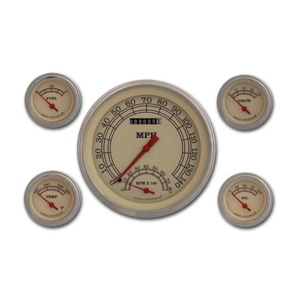 This 5 Gauge Kit Vintage Series 4-5/8" SpeedTachular Speedo/Tach Combo and 2-1/8" Fuel, Oil, Temp and Volt Gauges with Stainless Low Step Bezel Flat Glass Lens.