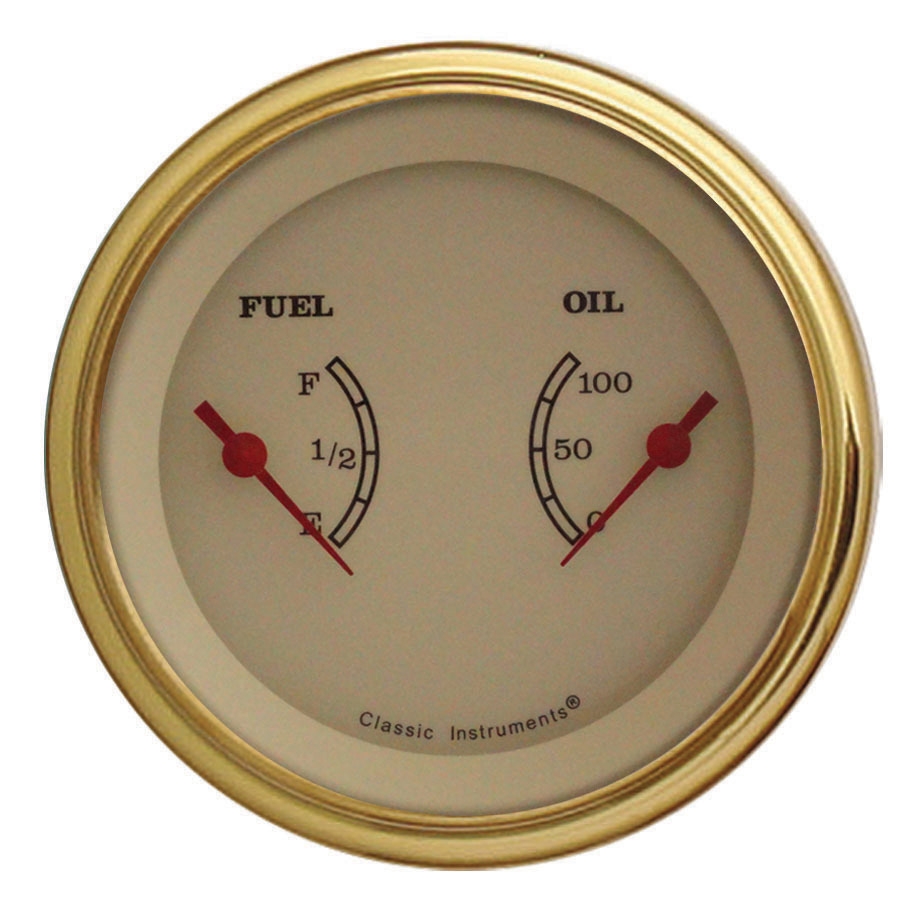 The Vintage Series 3-3/8" Dual Fuel and Oil Gauge in E to F and 0-100 psi Range with Gold Low Step Bezel Curved Glass Lens.