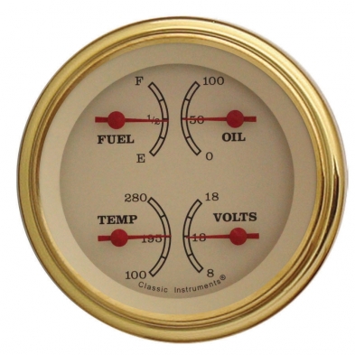 The Vintage Series 3-3/8" Quad Temp, Volt, Oil and Fuel Gauge with Gold Low Step Bezel Curved Glass Lens.